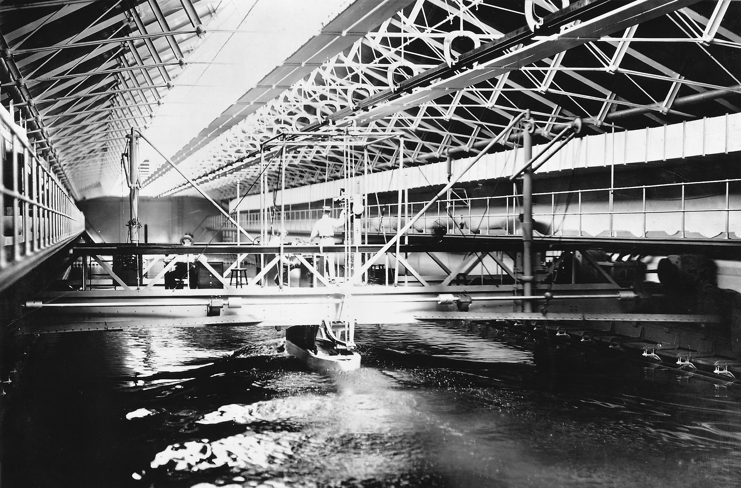 , faced by the model ship as it is propelled through the basin at velocity