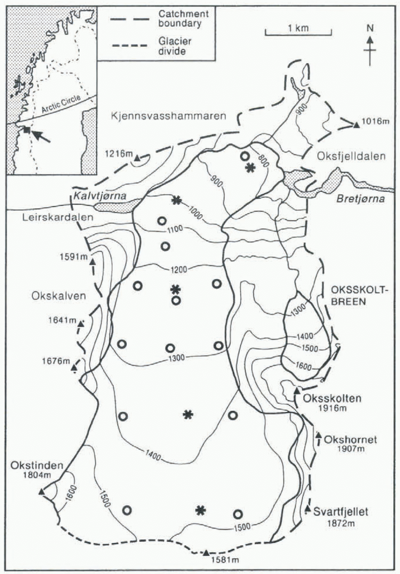 In 1995, the total seasonal balances of the inputs and outputs of seven ions were determined at Austre Okstindbreen, the largest glacier (14 km2) of the Okstindan area, Norway, at 66°01’ N, 14°18’ E, 40 km south of the Arctic Circle (Fig. 1). More than 1400 snow and water samples were collected from the 22.6 km2 catchment, which includes a second, much smaller glacier, Oksskoltbreen (1km2). The total glacierized area is 66% of the catchment. Nearly all the meltwater from above 1200 m drains in and under Austre Okstindbreen. The mean equilibrium-line altitude at the glacier is around 1250 m.