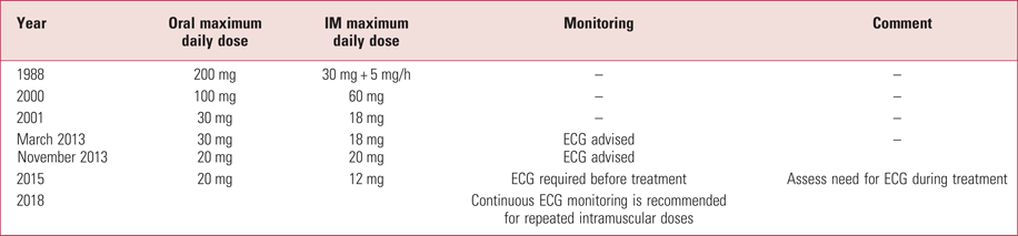 From 1988 to 2000, the British National Formulary (BNF) recommended a maximum haloperidol intramuscular dose of 30 mg followed by 5 mg up to every hour. However, nurses would not want to enter a seclusion room every hour. Over the past 30 years there have been dramatic changes in the advised doses of haloperidol – most notably since 2000 (Table 5). These changes reflect concerns about potential cardiac side-effects of the drug (in high doses) as well as a lack of evidence for greater efficacy with higher doses in the control of symptoms of schizophrenia. There is now a requirement for an ECG in any patient before administration of haloperidol. Intravenous use of haloperidol is no longer licensed or recommended, owing to a greater adverse effect on cardiac conduction.