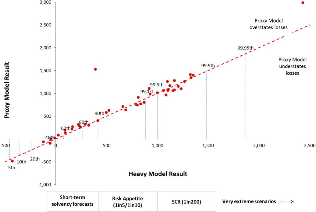 For many UK life insurers, it is not currently practical to revalue assets and liabilities in the large number of simulated scenarios generated in the previous step. This is because certain liabilities relating to with-profits business (such as the cost of guarantees) are usually valued using stochastic techniques. The resulting nested stochastic valuation is not currently practical due to technological limitations. Instead, a proxy model is used to approximate the profits and losses that would be produced by the “heavy” actuarial models in those scenarios. The proxy model typically consists of a number of “proxy functions” which describe the changes in values of assets and liabilities in response to changes in the risk factors. The proxy functions are defined at the level of sub-portfolios of risks (which collectively cover the whole undertaking) and are calibrated using standard fitting techniques such as least squares regression.
