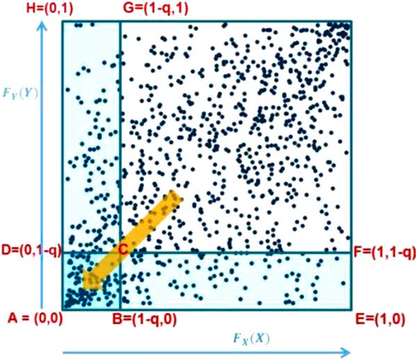 where the {R i } and {S j } are the ranks of the sample data {x i } and {y j }. Arachnitude takes values between −1 and 1 and is large when extreme high or low values of X tend to coincide with extreme high or low values of Y. It is therefore a measure of dependency along both diagonals rather than just along the 45° ray as in the case of tail dependence.