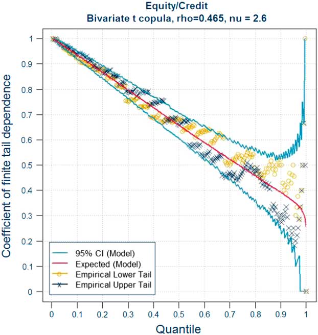 In this section we assume that the choice to use either a Gaussian or a Student’s t copula has already been made (i.e. the choice of dependency structure in the box labelled ‘2’ in Figure 1). We focus on techniques that may be used to inform and justify the selection of the parameters of these two copulas (i.e. the correlations and any other parameters in the box labelled ‘1’ in Figure 1). In particular, we consider how allowance can be made in the parameterisation, explicitly or implicitly depending on the choice of model, for tail dependence.