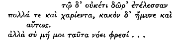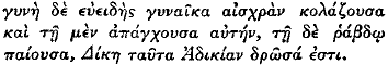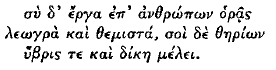 page 300 note 4 Indeed in direct contrast to Hesiod, in a fragment of Archilochus (fr. 94, E. Diehl, Anthologia Lyrica Graeca, 1952) the fox(?) is made to say, ![]()