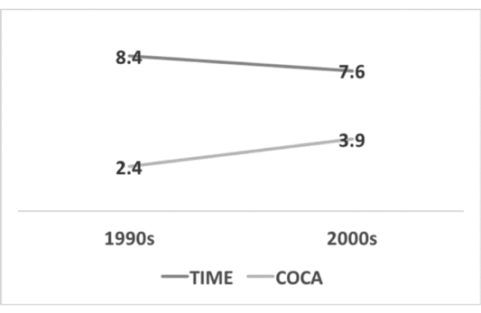 After a modest start in the early 1990s with 1.7 pmw in 1990–4, the frequency of EHM rose to 3.1 in the second time band and to 3.4 pmw in the 2000–4 time band. By the last period, 2010–11, the frequency is 6.4 pmw, or 3.76 times as high as in the first period, but still not as high as the 8.4 pmw high in TIME, recorded in the 1990s. Overall, the frequencies are much lower than those for TIME magazine for the same time periods. Adding up the five-year periods to decades in COCA, the differences between TIME and COCA in overlapping time periods are shown in figure 5.
