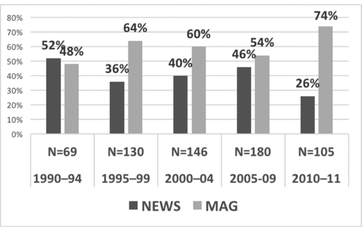 The frequencies of EHM turned out to differ between the two subcorpora in COCA. In the total sample, 60 percent of the 630 tokens appeared in the Magazine subcorpus, and 40 percent in the News corpus. Over time the proportions changed from almost a fifty–fifty distribution in the first period to about a quarter from News and three-quarters in Magazines in the last period, as shown in figure 6.