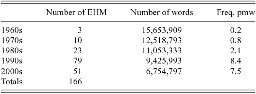 The total number of instances of EHM occurring in journalistic prose in TIME from the 1960s to the middle of the 2000s was 166, as shown in table 1.Footnote 10