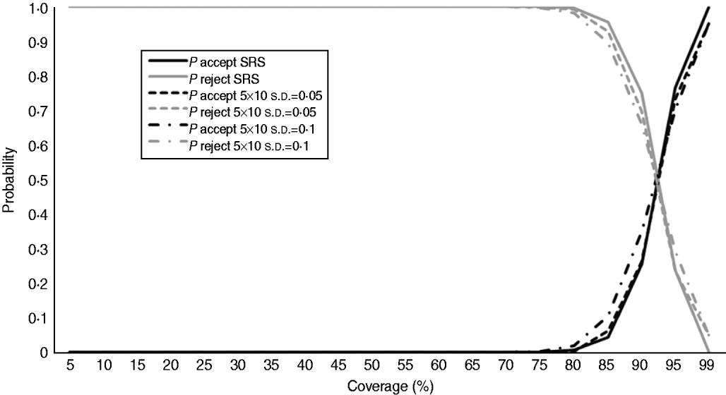 We calculated the operating characteristic (OC) curves of the sampling plans used to assess YF (Fig. 1) and OPV (Fig. 2) coverage according to SRS and the two 5×10 clustered designs (s.d.=0·05 and s.d.=0·10).