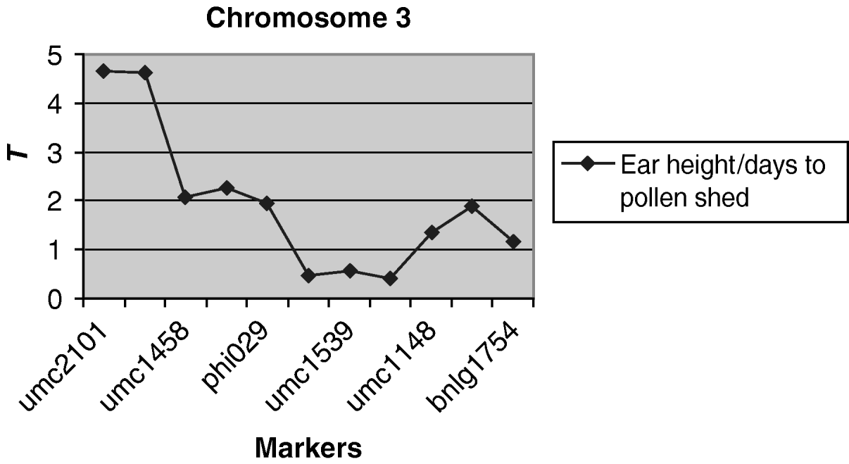 A weakly significantly (P<0·10) QTL associated with the environmental correlation between ear height and days to pollen shed was detected on chromosome 3 (Fig. 3). For markers umc2101 and umc1394 at this region, the difference in the coefficient of correlation between alleles was 0·12, which is 50% of the average environmental correlation. No QTLs were detected for the other pairs of traits.