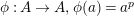 $\unicode[STIX]{x1D719}:A\rightarrow A,\unicode[STIX]{x1D719}(a)=a^{p}$