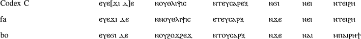 Having discussed the relationship between fa and bo, I should also say a few words about codex C. According to Kahle, this manuscript ‘is based on the text of the Sahidic Version, but a number of variants point to influence from the Fayyumic-Bohairic text’.Footnote 24 A comparison of the text of First Corinthians in fa, bo and codex C confirms this claim. For example, at 1 Cor 7.28, the Sahidic version (sa) reads: ⲛⲁⲓ̈ ⲇⲉ ⲛ̄ⲧⲉⲓⲙⲓⲛⲉ ⲛⲁϣⲉⲡ ⲑⲗⲓⲯⲓⲥ ϩⲛ̄ ⲧⲉⲩⲥⲁⲣⲝ.Footnote 25 In this instance, codex C departs from sa and follows fa and bo, as the following comparison demonstrates: