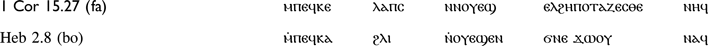 Finally, the last clause of 1 Cor 15.27 (fa) deserves special commentary. Here, bo reads ϣⲁⲧⲉⲛ ⲫⲏ ⲉⲧⲁϥⲑⲣⲉ ⲉⲛⲭⲁⲓ ⲛⲓⲃⲉⲛ ϭⲛⲉ ϫⲱⲟⲩ ⲛⲁϥ (‘except the one who made everything be subject to him’), faithfully rendering ἐκτὸς τοῦ ὑποτάξαντος αὐτῷ τὰ πάντα (‘except the one who subjected all things to him’). The text of fa, on the other hand, corresponds to οὐδὲν ἀφῆκɛν αὐτῷ ἀνυπότακτον (‘he has left nothing that was not made subject to him’) of Heb 2.8, thus bearing witness to a reading that has no support in the Greek tradition.Footnote 35 This assimilation of 1 Cor 15.27 to Heb 2.8 was undoubtedly triggered by the fact that both passages offer an exegesis of the same Old Testament passage (viz. Ps 8.7) and that both were considered to be written by the same author (viz. Paul). As the following comparison demonstrates, the text of 1 Cor 15.27 (fa) is identical to that of Heb 2.8 (bo).Footnote 36