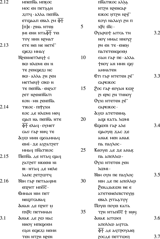 With respect to First Corinthians, a comparison of fa and bo makes either of these two simple solutions (fa → bo vs bo → fa) rather unlikely. That neither of them can be a daughter version of the other is best evidenced by those instances where bo and fa support different variant readings of the Greek tradition. For instance, at 1 Cor 3.5, bo reads ⲟⲩ ⲟⲩⲛ ⲡⲉ ⲁⲡⲟⲗⲗⲱ ⲟⲩ ⲇⲉ (±ⲡⲉ) ⲡⲁⲩⲗⲟⲥ, thus supporting the variant which the critical editions of the Greek text consider to be original (τί οὖν ἐστιν Ἀπολλῶς; τί δέ ἐστιν Παῦλος; ‘What, then, is Apollos, and what is Paul?’). Fa, on the other hand, reverses the order of Paul and Apollos and changes ‘what’ to ‘who’, reading ⲛⲓⲙ ⲟⲩⲛ ⲡⲉ ⲡⲁⲩⲗⲟⲥ̣ ⲛⲓⲙ ⲇⲉ ⲡⲉ ⲁⲡⲟⲗⲗⲱ̣, which corresponds to τίς οὖν ἐστιν Παῦλος, τίς δὲ Ἀπολλῶς; (‘Who, then, is Paul, and who is Apollos?’). This latter reading, which is clearly secondary,Footnote 19 is attested in several Greek witnesses, most notably in the Byzantine text.