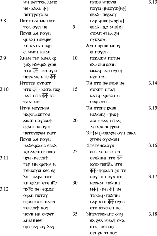 (15.17) ⲧ̣ⲉ̣ⲛ̣|ⲡⲓⲥⲧⲓⲥ: the ink traces at the end of line 37 are impossible to discern. However, though all witnesses of bo read ⲡⲉⲧⲉⲛⲛⲁϩϯ, the available space seems to make the reading ⲧ̣ⲉ̣ⲧ̣ⲉ̣ⲛ̣|ⲡⲓⲥⲧⲓⲥ rather unlikely.
