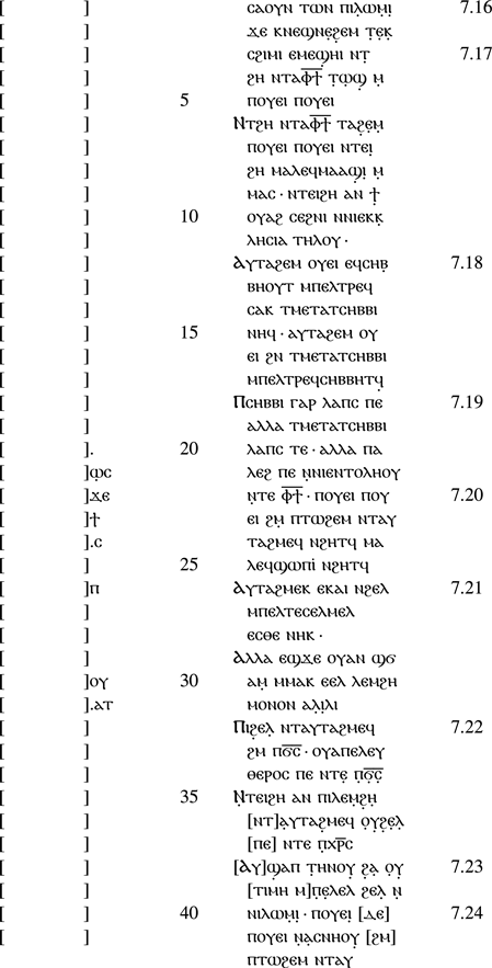 (7.24) [ⲇⲉ]: the line appears to be too short in comparison to the ones above and below, unless we supposed that a few letters were lost in the lacuna. I restore [ⲇⲉ], assuming that fa agrees with the variant reading attested in several witnesses of bo.