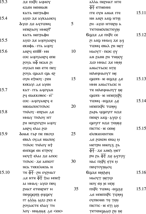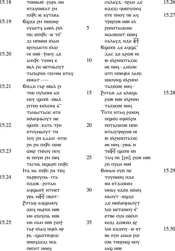 2 L. Depuydt, Catalogue of Coptic Manuscripts in the Pierpont Morgan Library (2 vols.; Corpus of Illuminated Manuscripts 4–5; Leuven: Peeters, 1993) i.462. For instance, at 1 Cor 14.34, instead of ϩⲩⲡⲟⲑⲁⲥⲥⲉⲥⲑⲉ, read ϩⲩⲡⲟⲧⲁⲥⲥⲉⲥⲑⲉ; at 1 Cor 15.12, instead of ϩⲉⲛϩⲗⲓ, read ϩⲉⲛϩⲁⲓ[ⲛⲓ].
