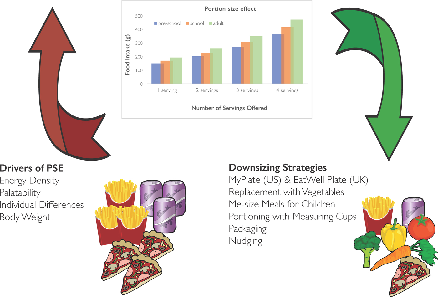 An obvious and simple solution to the PSE is to offer small portions of HED snacks and meal items, particularly for children. Whether children and adolescents accept downsized portions without compensating elsewhere in the diet is not yet known. At least in the early years, there is the potential to set expectations of what size, volume and amount of food is appropriate within the context of a healthy diet, and to encourage a greater proportion of fruit and vegetable intake. Parents need clear guidance on portion sizes to promote appropriate consumption norms in the face of the robust nature of the PSE and the potential for perceptual errors in judging portion size, especially for HED snack and meal items. This guidance may take the form of visual aids on dishware, providing vegetables and fruit on half the plate, offering medium-sized, pre-packaged snacks and offsetting small portions with a variety of highly liked LED alternatives (see Fig. 1). Given the potential link between large portions, overconsumption and body weight status, practical recommendations to guide portion decisions are needed. However, creative solutions to downsizing place emphasis on individual families to control portions for children and adolescents. There is a considerable public support for the government working with businesses to develop products with fewer energy and in smaller portions as evidenced by Public Health England in their energy reduction initiative (https://www.gov.uk/government/publications/calorie-reduction-the-scope-and-ambition-for-action). If this initiative is combined with clearer labelling on portion/serving sizes for children and businesses produce smaller, pre-packaged ‘child size’ portions of foods, then together this will lead to changes in the obesogenic environment promoting downsized portions as the new consumption norm for HED foods and beverages.