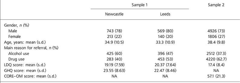 The psychometric properties of the scale were tested in three separate samples. Samples 1 and 2 were used for testing validity and internal consistency. Sample 1 consisted of 1665 new service users attending NHS services in Leeds and Newcastle. The assessment package comprised self-reported substance use, dependence as measured by the Leeds Dependence Questionnaire (LDQ; Reference Raistrick, Bradshaw and ToberRaistrick et al, 1994) and psychopathology as measured by the General Health Questionnaire (GHQ; Reference Goldberg and WilliamsGoldberg & Williams, 1988). Sample 2 consisted of 6732 new service users attending the Leeds service. For this sample the assessment package had been updated to measure psychopathology using the Clinical Outcomes in Routine Evaluation – Outcome Measure (CORE–OM; Reference Evans, Connell and BarkhamEvans et al, 2002). Sample characteristics are presented in Table 1.