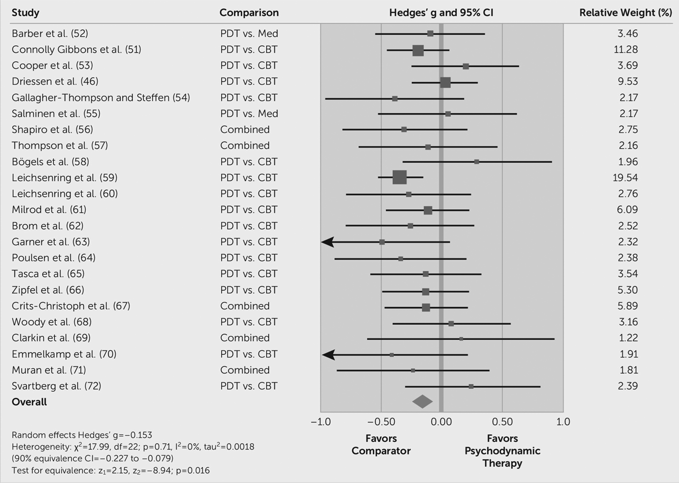 We explicitly reject Leichsenring's notion that we misrepresented the results of the Steinert et al. (Reference Steinert, Munder, Rabung, Hoyer and Leichsenring2017) study. Therefore, we present the original results in Fig. 1 here again. While the authors concluded that results indicate equality between two treatments, we noted that for some variables, significant differences are reported. The overall effect as depicted by the diamond of Fig. 1 clearly indicates a significant disadvantage at post-treatment of psychodynamic treatments compared with other psychological interventions [g = −0.153; 90% confidence intervals (CI) −0.23 to −0.08], or compared with cognitive behavioral therapy (CBT) (g = −0.16; 90% CI −0.24 to −0.08; please note: CI are similar if tested for equivalence compared with superiority). These results are of special interest because the financial sponsor was a German psychodynamic society, and the principal investigators are well-known for their advocacy in favor of psychodynamic treatments (despite one CBT-coauthor). This example illustrates one major point we wanted to make: the very same dataset can confirm the superiority of one treatment, and the equivalence of both treatments, depending on the chosen methodological approach. Again, Leichsenring et al. do not reject this conclusion, which is mainly built on methodological reasoning independent of this specific example, and which we consider as relevant to be discussed in the scientific community. For more details and critical aspects of non-inferiority/equivalence trials, we refer the reader to our original commentary.