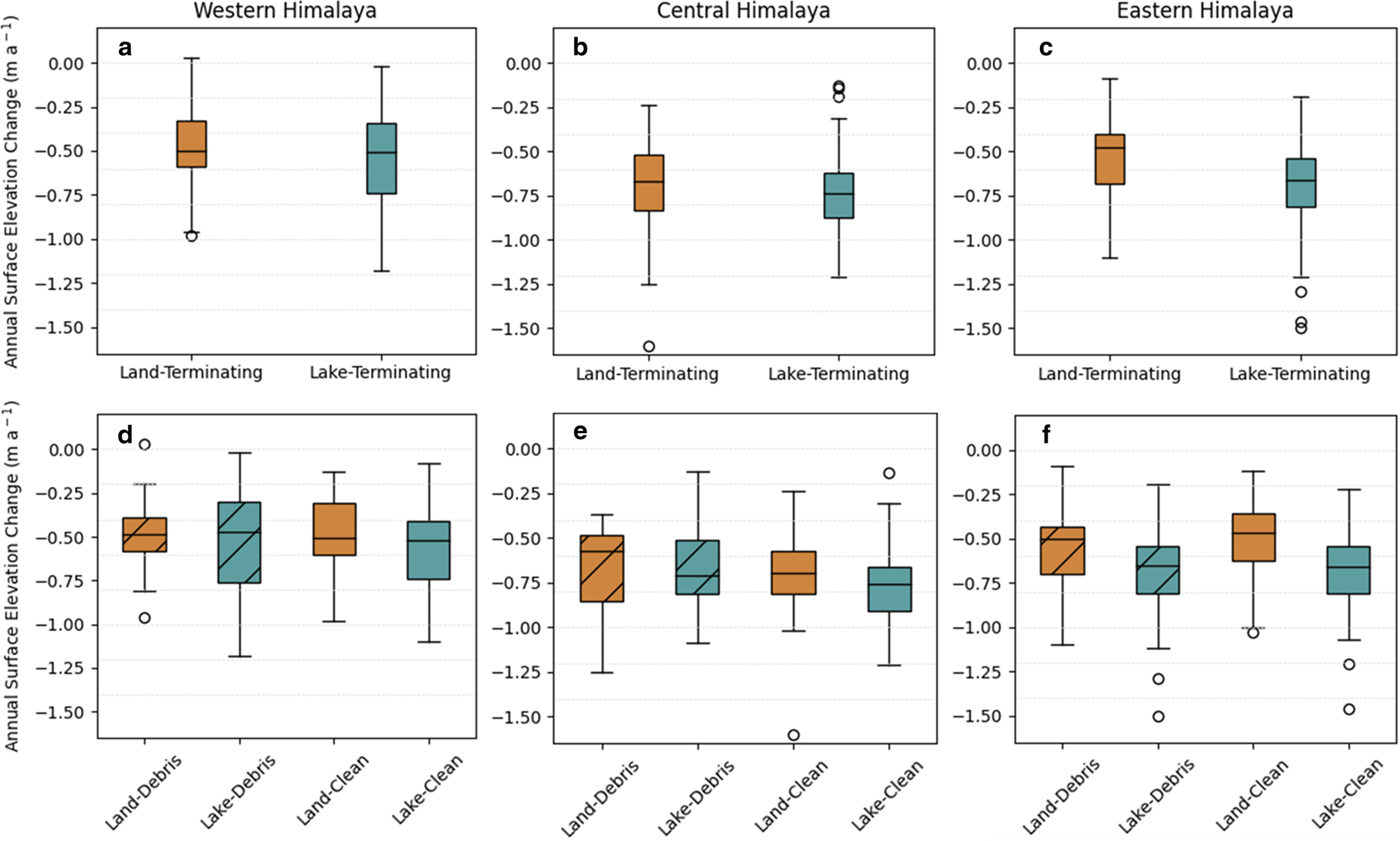 Figure 2. Boxplots summarising rate of mean surface elevation change between 2000 and 2019 for glaciers by terminus type in (a) Western Himalaya (n = 38 and 40), (b) Central Himalaya (n = 45 and 44) and (c) Eastern Himalaya (n = 93 and 92) and glaciers by terminus and surface cover type for (d) Western Himalaya, (e) Central Himalaya and (f) Eastern Himalaya.