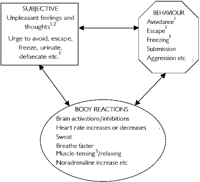 Fear, like any emotion, is a loosely linked network of responses spanning feelings, thoughts, behaviours and physiological events (Fig. 1). These are normal unpleasant reactions to threat. They constitute an emotional response syndrome. When excessive, such responses are what anxiety disorder patients want to reduce.