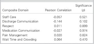 During the study period, 3,794 patient surveys were completed for 130 eligible ED physicians. Overall, the survey response rate was 45%. Mean patient age was 52 years (SD=20; 45% male). Mean physician age was 45 years (SD=9; 80% male) (Table 1). A detailed table of physician productivity versus composite domain scores can be found in Appendix 3.