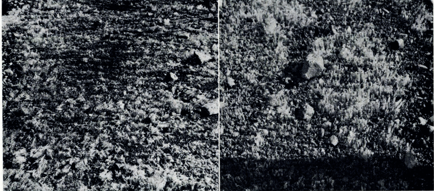Fig. 1. Needle-ice columns melting in the early morning sun at an altitude of 1750 m, Garibaldi Park, south-western British Columbia, Canada. Note the shadows of the sun in line with the stripes, and the collapsing ice needles. Al this site, very little .mil has been uplifted by the needles.