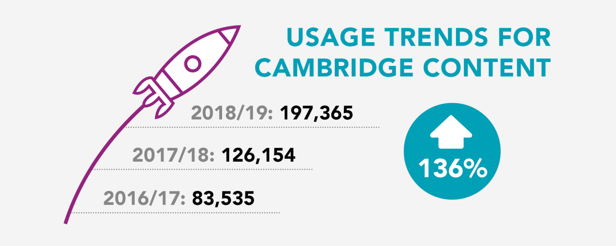 As EBA has become more established a clear trend has emerged – in most cases usage of Cambridge content grows year on year the longer the EBA term is active for. The illustration below uses real usage statistics from an EBA customer in the UK.
