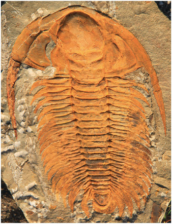 Figure 1.2 Fossil record of a trilobite, circa 500 million years ago. Trilobites such as the one shown in this picture had compound eyes, probably not too different from those found in modern invertebrate species like flies. Trilobites proliferated and diversified throughout the world for about 300 million years. By Dwergenpaartje, CC BY-SA 3.0