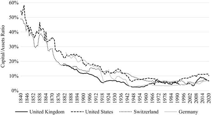 Figure 2.1 shows the evolution of bank capital as a percentage of the total assets from 1840 to 2020 for Germany, the United Kingdom, the United States, and Switzerland. From the early 1880s, data is only available for Switzerland and the United States. The capital/assets ratios in both countries remained above the 30% threshold until 1871 (Switzerland) and 1873 (United States). In the subsequent decade, both countries’ capital/assets ratios experienced a further decline, falling to the 20% level.