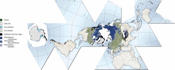 Figure 1.1 The global distribution of the components of the cryosphere (from Hugo Ahlenius, courtesy UNEP/GRID-Arendal, Norway) (http://upload.wikimedia.org/wikipedia/commons/b/ba/Cryosphere_Fuller_Projection.png)