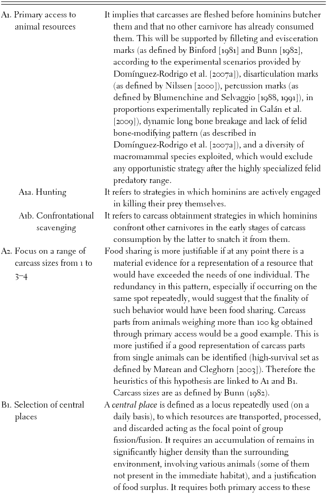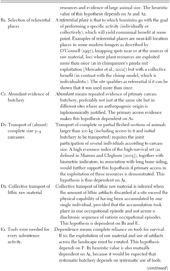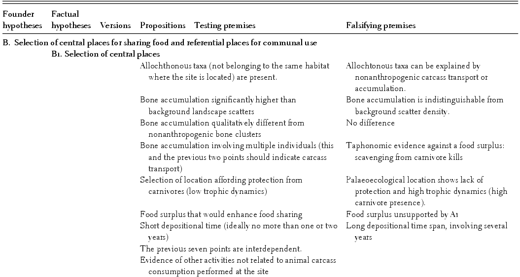Processual approaches to anthropological issues have provided hypothesis-testing frameworks, often testing opposite propositions beyond the null hypothesis. The most common pattern for anthropologists is to test hypotheses individually, however. This limits the heuristic capacity of each hypothesis given the common phenomenon of equifinality in historical and contextual processes. By linking hypotheses, this problem is frequently overcome, given that the heuristic value of each hypothesis is reinforced by those of the other hypotheses to which it is linked, and therefore on which it is dependent. For instance, the hypothesis that hominins focused on the exploitation of large carcasses (especially those larger than 100 kg; Hypothesis A2) is constructed on the premise that accumulations of animals these sizes must occur at sites. Taken in isolation, this assumption invalidates the hypothesis because other nonanthropogenic processes (e.g., natural deaths at ponds during droughts, accumulation of carcasses by certain carnivores in dens or death arenas) can produce the same result. If it is linked to hypothesis A1, the heuristic value of hypothesis A2 increases, because the co-occurrence of an accumulation of carcasses of that size range on the same spot with unambiguous evidence of having been primarily exploited by hominins invalidates the purported equifinality with a scenario of carcasses accumulated by carnivores (and initially consumed by them). If the link of A2 is extended to B1 (selection of central places), the other possible equifinality scenario of hominins exploiting naturally accumulated carcasses by catastrophic phenomena vanishes, because B1 requires taphonomic support for dynamic (transport-caused) processes in carcass accumulation.