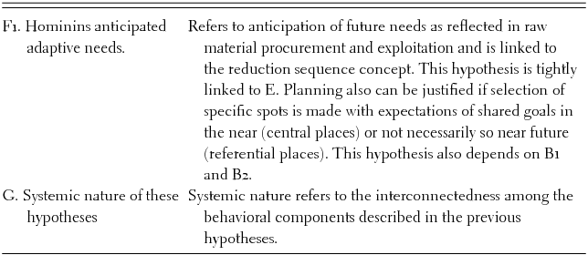 In the theory constructed here on the origins of human behavior, most factual hypotheses show a direct link to the factual hypotheses from which they derive and also single or multiple dependence links to other hypotheses, as can be seen in Figure 1.1. This link is explained in Table 1.4. This theory can be used as a good demonstration that the contribution of each hypothesis to the main axiom of the theory is not even. Some hypotheses contribute more crucially than others. For instance, A1 shows mostly unidirectional links to almost one half of the other hypotheses, which indicates that 45% (five of eleven links) of the heuristic power of the theory depends on A1; that is, the extent to which high resolution can be reached in discerning primary access by hominins to large carcass faunal resources, producing the food surplus necessary to justify intentional food sharing by its repeated transport to the same locus.