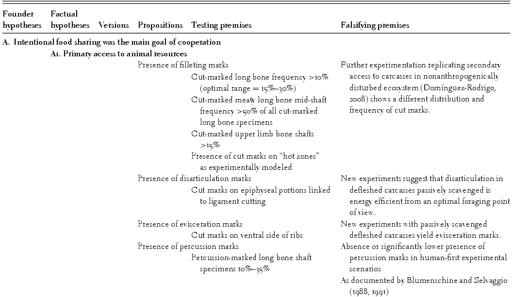 Each of the factual hypotheses that make up the bulk of the theoretical body supported here, with some of their crucial testing and falsifying premises, can be seen in Table 1.3. The elucidation, sharpening, and definition of these hypotheses (senso Bunge [Reference Bunge1998a]) are described in Table 1.4. I will comment on only some of the reasons why some variables and hypotheses commonly used by some researchers to tackle the first founder hypothesis presented here were excluded. Food sharing requires food surplus, which in turn, if regularly obtained, requires primary access to carcass resources in modern African savannas. I have used some taphonomic indicators as analytical variables (converted into silogistic propositions inside hypotheses), which emphasize the careful and correct identification of hominin-imparted signatures preserved in the fossil record (namely, cut marks). This goes against a common trend among some Plio-Pleistocene archaeologists who postulate equifinality scenarios for those signatures and emphasize indirect reading of hominin authorship in any given bone assemblage through the imprints created by carnivores (Blumenschine, Reference Blumenschine1995; Capaldo, Reference Capaldo1995, 1997; Blumenschine et al., Reference Blumenschine, Peters, Capaldo, Andrews, Njau, Pobiner, Pickering, Schick and Toth2007; Ferraro, Reference Ferraro2007; Pobiner, Reference Pobiner2007). This may seem counterintuitive, and indeed it is. These authors claim that a high frequency of tooth-marked specimens on long bone midshafts is indicative of carnivores (namely, felids) having had priority in carcass exploitation and a significant input in the formation of bone assemblages, whereas a low frequency of tooth-marked specimens reflects the opposite, that is, the intervention of scavenging carnivores postdepositionally to ravage bones previously exploited by hominins. This assertion is incorrect for the following reasons, however: first, from a theoretical point of view it is aberrant, because to make the original claim of primary access by strict flesh-eating carnivores (felids, to enable hominins to intervene secondarily [as in Blumenschine, Reference Blumenschine1995]), experiments were conducted with durophage carnivores (e.g., bone-crunching hyenas) yielding high tooth-marking estimates, instead of with felids. Second, as expected, given the different tooth properties of felids and hyenids, taphonomic studies made on felid-eaten carcasses yielded much lower frequencies of tooth-marked broken bone specimens, indistinguishable from those abandoned by some durophage carnivores having secondary access to human-exploited bone assemblages (Domínguez-Rodrigo et al., Reference Domínguez-Rodrigo, Barba and Egeland2007a, Reference Domínguez-Rodrigo, Pickering, Egeland, Pickering and Shick2007b). Researchers relying on carnivore-made tooth marks therefore should look for low frequencies of tooth-marked midshaft specimens if interpreting that flesh-eating carnivores had access to carcasses before hominins did. Third, tooth marks on midshaft portions of long bones are subject to equifinality: most researchers assume that they were caused by nonprimate carnivores, but nobody has been able to exclude other tooth-marking agents such as nonhuman primates (Pickering and Wallis, Reference Pickering and Wallis1997; Domínguez-Rodrigo, Reference Domínguez-Rodrigo and Ullrich1999), hominins (White and Toth, Reference White, Toth, Pickering, Schick and Toth2007), or suids (Domínguez-Solera and Domínguez-Rodrigo, Reference Domínguez-Solera and Domínguez-Rodrigo2009).