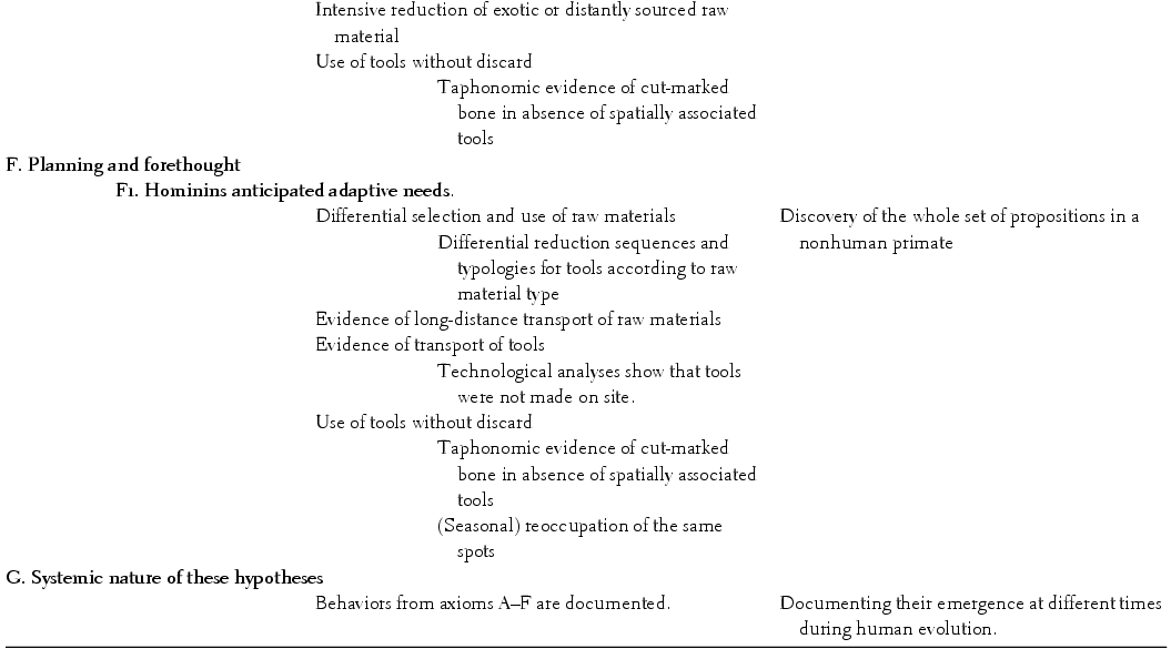 A theory requires a hierarchy of theoretical factual concepts, organized systematically. At the apex of a theory on the origins of human behavior is the generic ontological concept of “human behavior.” If we recall Isaac's (1978) diagnosis and expand it, we can structurally define human behavior, as opposed to nonhuman primate behavior, following the categories and components shown in Table 1.1. This reasoning is analogical and compares human and nonhuman primates, and the differences are the defining features. Such an analogical reasoning cannot be uncritically applied to the past, however. First, it is not articulated systematically within the body of a theory. Second, it does not define how many of these features are necessary to document in the evolutionary record to qualify as “human.” Third, it does not specify whether these features evolved independently or are interrelated. Fourth, no description was provided of how these features (converted into hypotheses) could be tested and what their falsifying premises would be. It is in these four lacking points that all strict analogical efforts applied to the interpretation of the archaeological record fail.