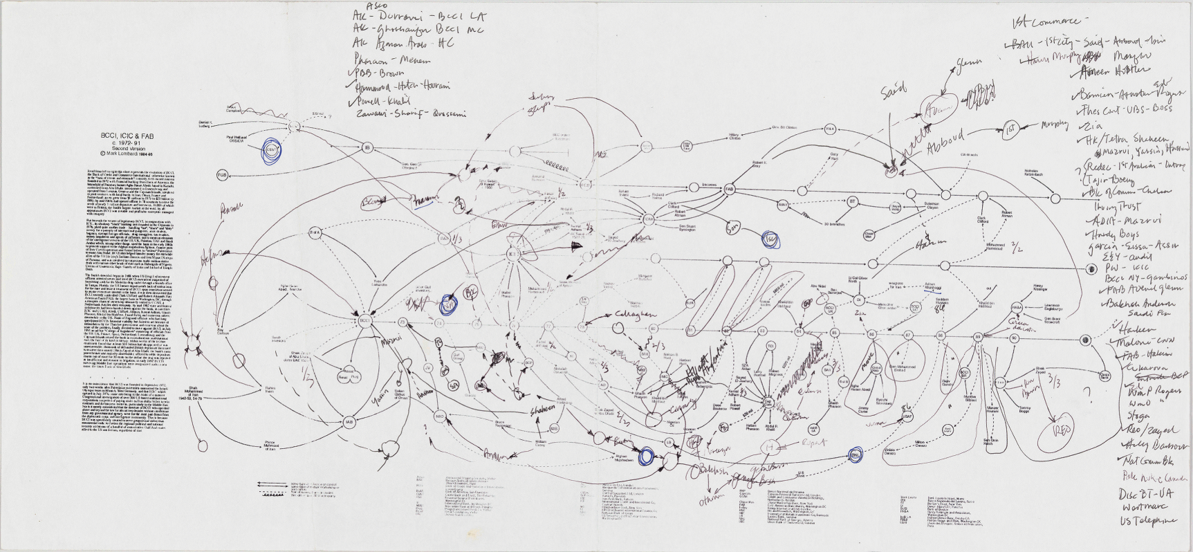 Figure 1 Lombardi, Mark (1951–2000), ‘BCCI-ICIC & FAB, 1972–91 (4th version)’ from the series BCCI, ICIC & FAB, 1996–2000. Graphite and coloured pencil on paper. New York, Whitney Museum of American Art.