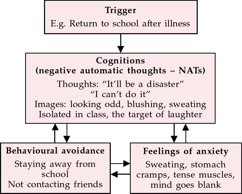Cognitive–behavioural therapy for anxious children can be built around a formulation of the problem in cognitive–behavioural terms. For example, a boy avoiding school after illness may have potent feelings, images and thoughts of a disastrous inability to cope on return to school; he may, by avoidance behaviour, maintain and increase his fears. A functional cognitive assessment will identify antecedents and consequences of behavioural avoidance, as well as somatic and emotional responses together with the precise thoughts and images relating to that specific situation for that particular child.
