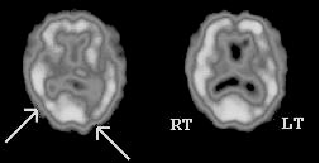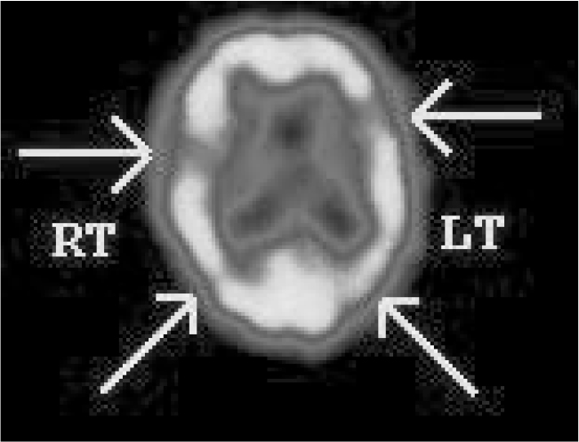 FIG 2 Tc-99m HMPAO single-photon emission computed tomography findings in a patient with cognitive impairment. The scan shows patchy perfusion defects in temporal and parietal lobes bilaterally, with reduction in perfusion to the occipital lobes (right > left). These findings are in keeping with vascular dementia.