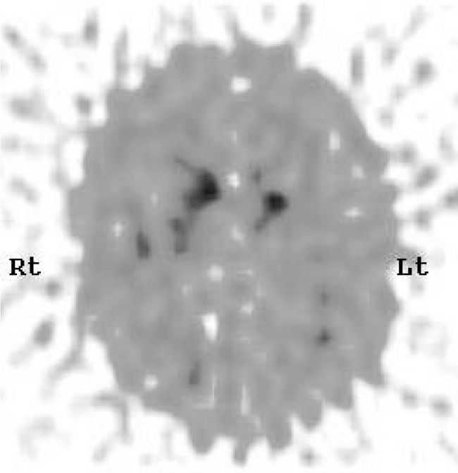 FIG 3 DaTSCAN for a patient with suspected dementia with Lewy bodies. The scan shows reduced tracer uptake in both putamina, with relatively normal uptake in the heads of caudate nuclei bilaterally. These findings are in keeping with dementia with Lewy bodies.