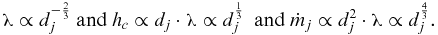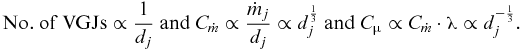 {\rm No.\ of\ VGJs} \propto \frac{1}{d_j}\ {\rm and}\ {{C_{\dot m}} \propto \frac{{\dot m}_{j}}{d_{j}} \propto {d_{j}^{\frac{1}{3}}}}\ {\rm and}\ {{C_{\mu}} \propto {C_{\dot m}} \cdot {\lambda} \propto {d_{j}^{-\frac{1}{3}}}}.