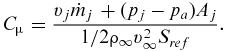{{C_\mu } = \frac{{{v_j}{{\dot m}_j}\, + ({p_j} - {p_a}){A_j}}}{{1/2{\rho _\infty }v_\infty ^{\rm{2}}{S_{ref}}}}}.