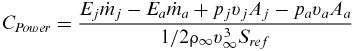 {C_{Power}} = \frac{{{E_j}{{\dot m}_j} - {E_a}{{\dot m}_a} + {p_j}{v_j}{A_j} - {p_a}{v_a}{A_a}}}{{1/2{\rho _\infty }v_\infty ^3{S_{ref}}}}