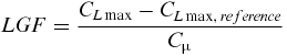 LGF = \frac{{{C_{L\max }} - {C_{L\max ,\,reference}}}}{{{C_\mu }}}