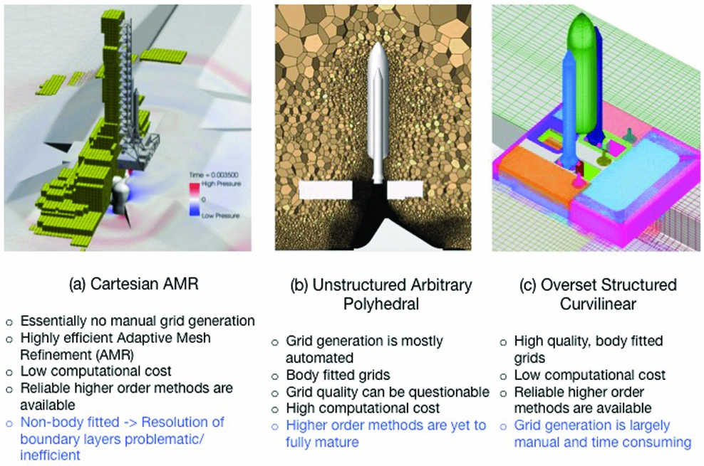 Three representative samples of different grid approaches are shown in Fig. 5 for launch vehicle simulation as discussed by Moini-Yekta et al(Reference Moini-yekta, Barad, Sozer and Housman128). These are Cartesian (Fig. 5(a)), unstructured (Fig. 5(b)) and overset structured grids (Fig. 5(c)). The benefits and shortcomings of each are listed in the figure for comparison.