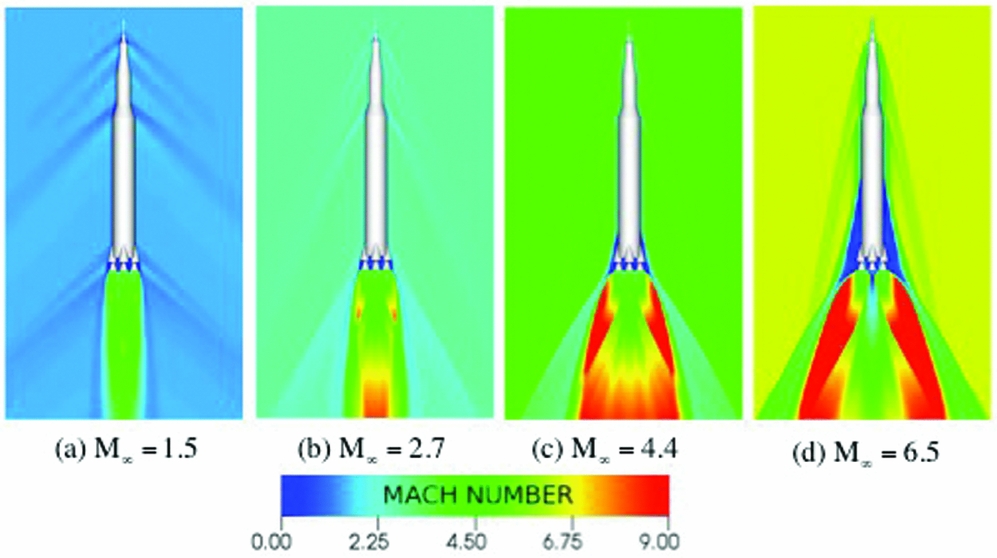 Basic test cases for GC5 are to compare LES, various versions of DES, and ILES for a selected number of basic flows such as the decaying box turbulence, flow over a cylinder and back step flow. Then, to test model performances in a real-world situation, simulation of plume-induced flow separation (PIFS) for the Apollo 6 flight is proposed where flight data and RANS computed results are available (Gusman et al(Reference Gusman, Housman and Kiris134)). This test case offers the opportunity to examine in detail the performance of DNS- and LES-based modelling approaches, which are particularly relevant to complex geometry applications such as separated flow, shear-layer interaction, plume-separated boundary-layer interaction and interaction of multiple jets and wakes. An example of RANS computed results is illustrated in Fig. 8. Sensitivity to grids and time-step sizes can also be assessed by comparing the best solutions to the results from other codes and experimental data. Specific modelling requirements can also be derived for supporting vehicle development and operations.