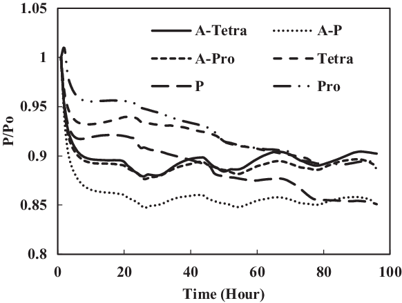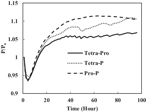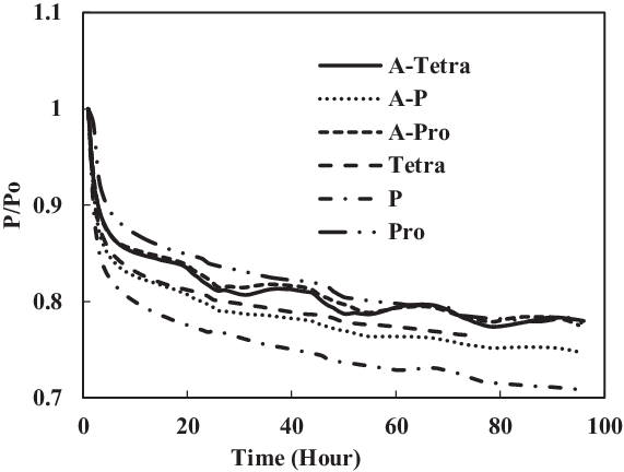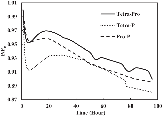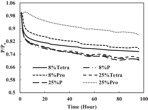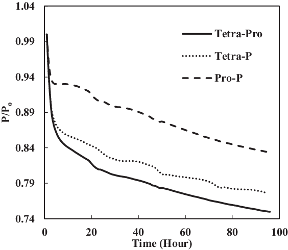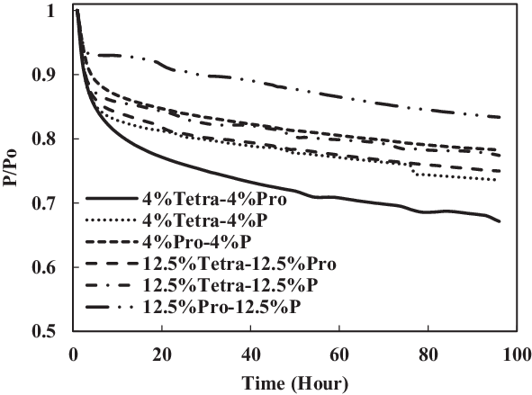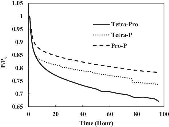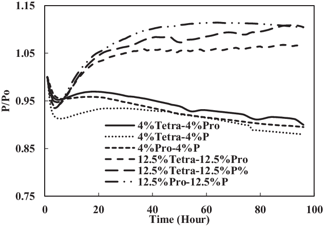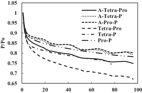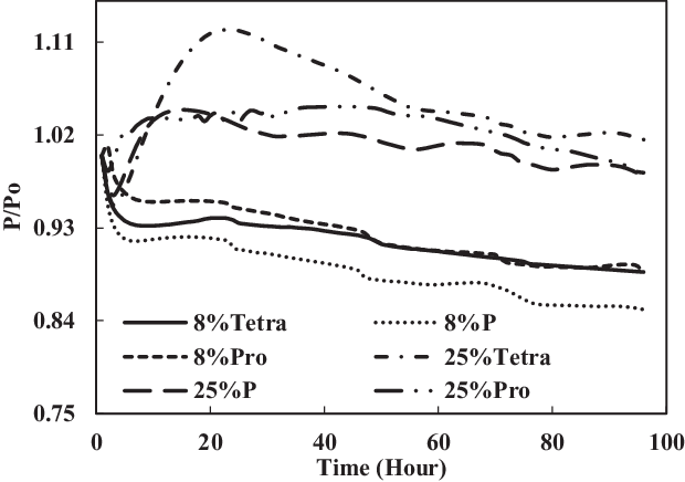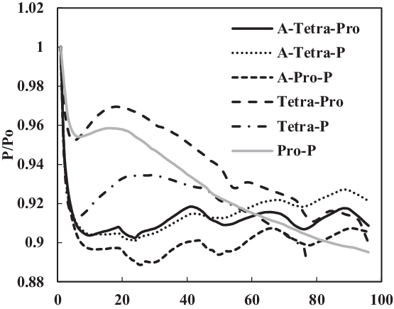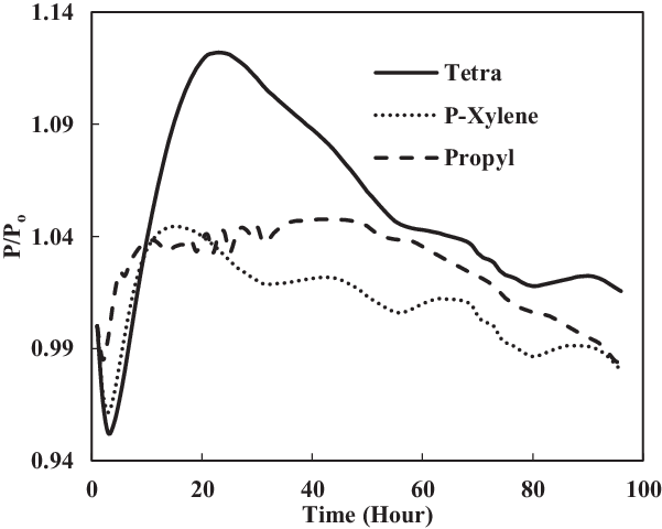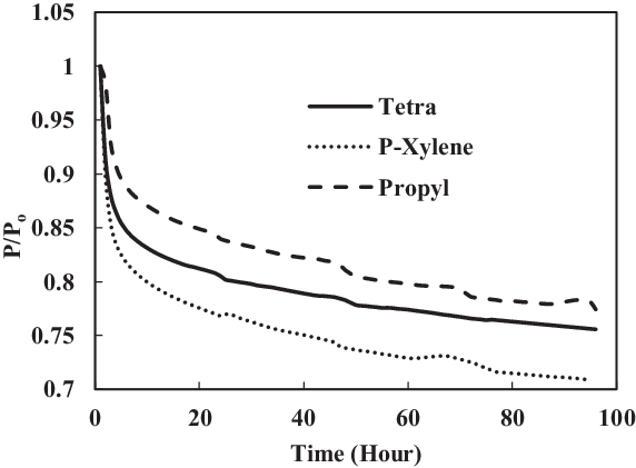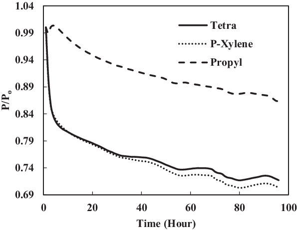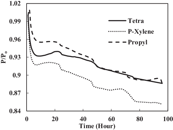 For fluorosilicone O-rings, no significant swells occurred (Fig. 11). The highest maximum value of P/Po was also obtained by the nitrile O-ring in the mixture of propyl benzene and p-xylene. The maximum P/Po value for fluorosilicone seals was only 1, while other nitrile O-rings achieved the maximum value of P/Po with a value greater than 1.