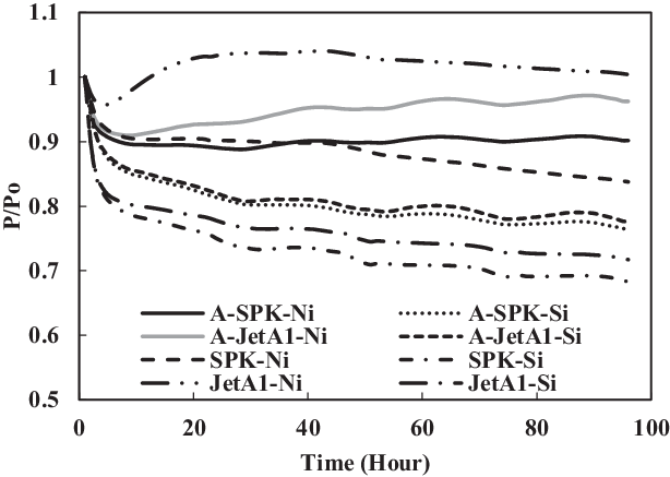 Figure 7 shows that no swelling was observed for fluorosilicone O-rings in all the above three fuel mixtures. Unlike nitrile, the biggest swelling effect of fluorosilicone O-ring occurred in the SPK mixture of propyl benzene and p-xylene. This is because the role of polarity, molar volume and hydrogen bonding potential in swelling is only dominant in nitrile O-rings. Since rate of swelling depends on various factors, only the net factors of volume swell must be considered. It can also be seen that the maximum values of P/Po for all the 4% fuel mixtures were the same and occurred at the starting point.