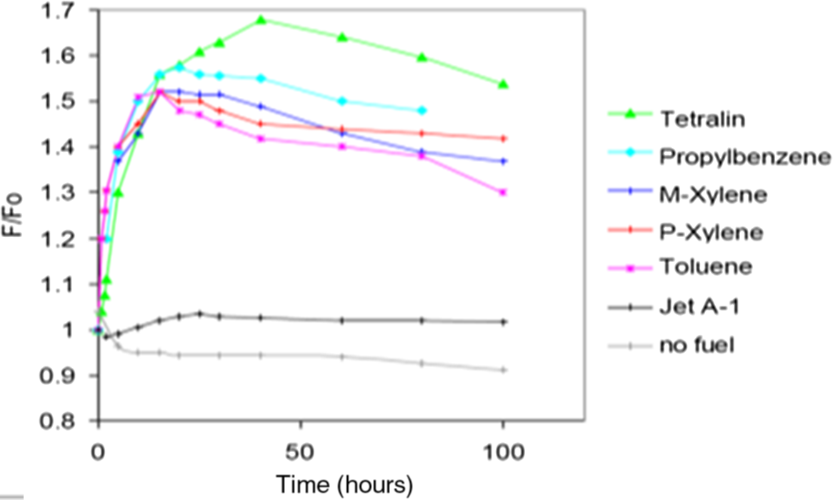 Three types of aromatics and three different fuels were used together. The conventional jet fuel, Jet-A1, was used as a reference for this study. The other two fuels used were SPK and Severely Hydro-processed Jet Fuel from Conventional Source (SHJFCS). The SPK made of animal fats was obtained from Shell while the Jet-A1 was from British Petroleum (BP) plc. The aromatics involved were tetralin, propyl benzene and p-xylene (Table 2). Tetralin is basically a naphthalene hydrogenated at high pressure with the presence of a catalyst. These aromatics were chosen based on a study done by Anderson(Reference Anderson13). As seen in Fig. 2, tetralin and propyl benzene gave the highest F/Fo among the five aromatics tested. The F/Fo can be identified as swelling rate. Meanwhile, p-xylene showed average swelling rate, but it attained a stable swelling rate after a few hours.