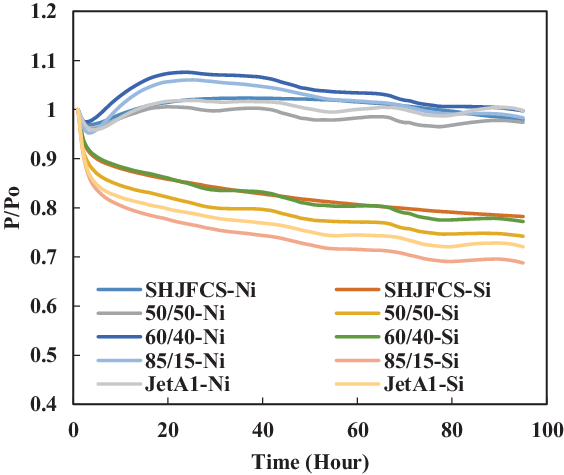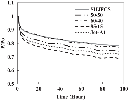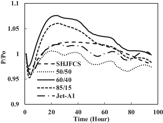 However, the maximum P/Po value for the 50/50 blend was lower than that of both SHJFCS and Jet-A1, and the maximum P/Po value for the 85/15 blend was lower than that of the 60/40 blend. It can be deducted that the optimum blend of SHJFCS and Jet-A1 ranges between 50% and 85% Jet-A1.