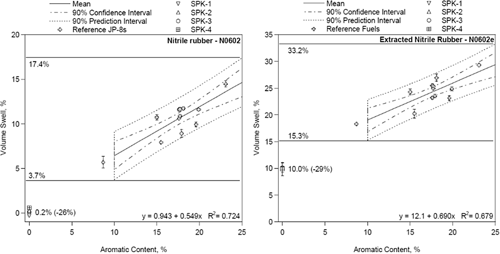 However, swelling rate does not depend solely on aromatics concentration but also on type of aromatics within the fuel. Meanwhile, the optimum blending percentage of Jet-A1 and SHJFCS from TC-4 was 60% Jet-A1 and 40% SHJFCS. The results show a linear relationship between rate of seal swelling and fuel’s total aromatic concentration and type of fuel. Overall, this research has allowed some inferences regarding seal swell. Since more synthetic fuels are being created every day, more tests need to be conducted to determine their compatibility with seals in engines.
