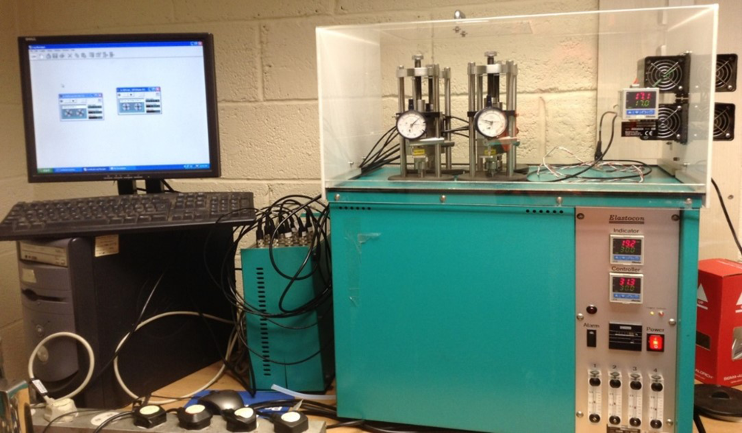 The tests were conducted using the Relaxation Rig System EB02 made by Elastocon AB (Fig. 4). Four rigs can be placed and run simultaneously in the cell oven. The temperature in each rig can also be set differently. The stress relaxation system was used to study seal compatibility under different conditions of either tension or compression. Different standards of regulation must be used when using tension or compression. The load cells and rig temperature sensors were calibrated to function precisely. These parts were then connected to the data connection box to enable data recording of the rig temperature and force exerted by the O-ring. The dial gauge was also checked for any faults.